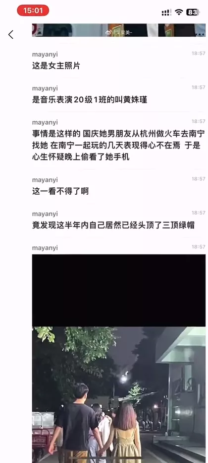 广西大学行健文理学院的黄姝瑾,被称为“究极海后渣女”,在背着自己的男友的同时,竟然与三名男子保持不正当关系。她似乎特别偏爱绿色,可能是因为这让她乐于为男友带上“绿帽”。远在异地的男友,经过一番努力终于来到她身边,却意外发现了她手机中的秘密,自己无缘无故地戴上了三顶“绿帽”。
