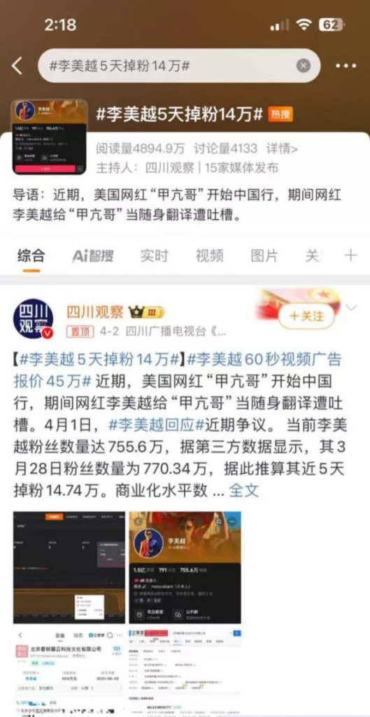 抖音750万粉丝大网红李美越,打造一手中华文化宣传的形象,宣称自己是中美混血儿,但有内幕人士指出其实是越美混血。自从发现流量密码之后,疯狂给自己立宣传中华文化的代表,疯狂吸纳700多万粉丝,一条60秒广告更是报价45万。
