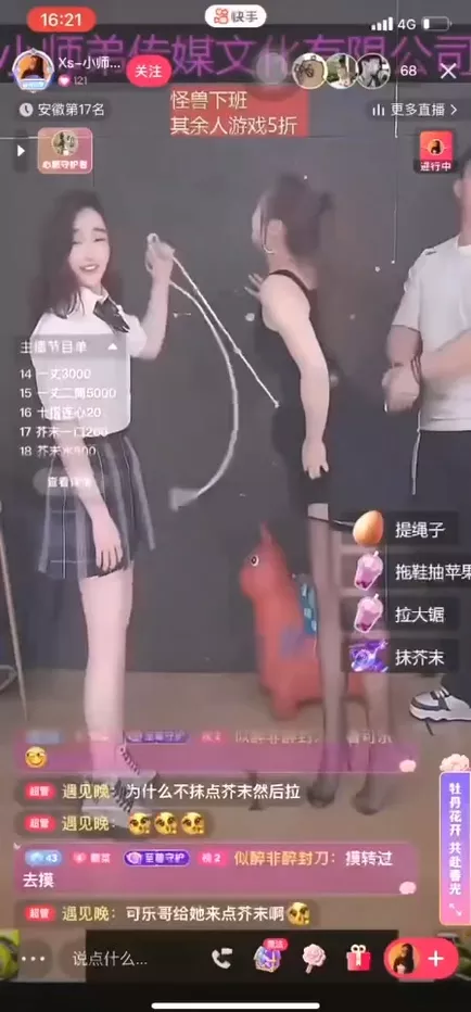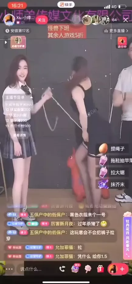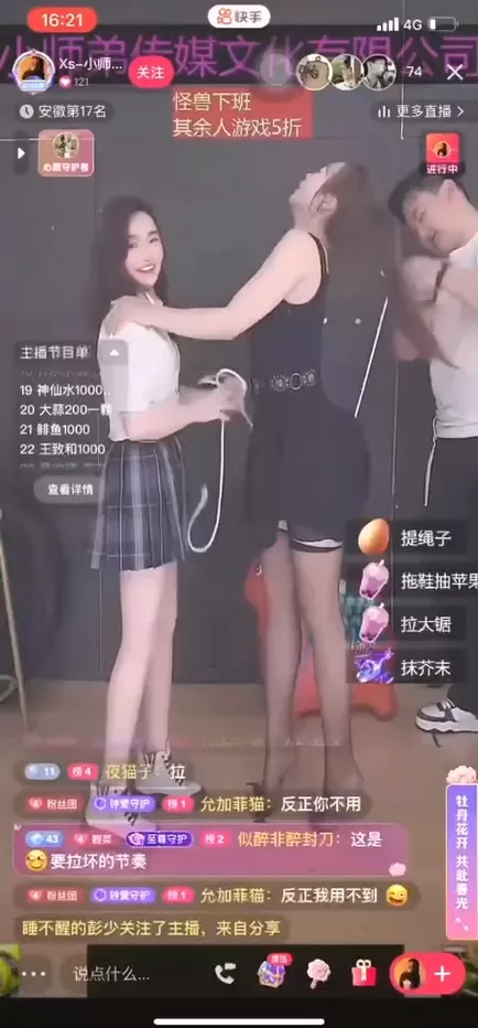 抖音直播间的女主播又玩出新花样,两个助力者拿着一根绳子在她两腿之间来回摩擦,效果甚至超越了跳蛋,速度之快让女主播几乎要达到巅峰。可见,为了吸引眼球,她们的创意真是让人惊叹不已。
