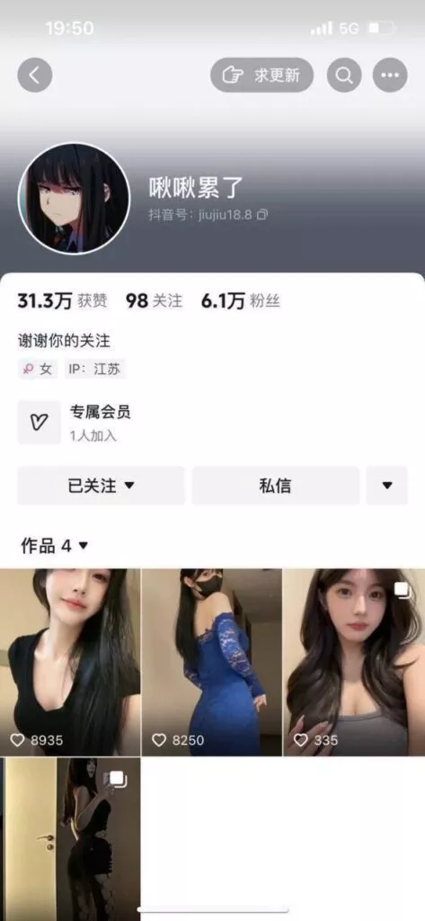 虽然粉丝不多,但却是相当会整活。抖音6万粉丝小有名气的高颜值擦边御姐网红啾啾累了,可能是太想进步了,大尺度私拍福利视频流出,全程露脸果拍。