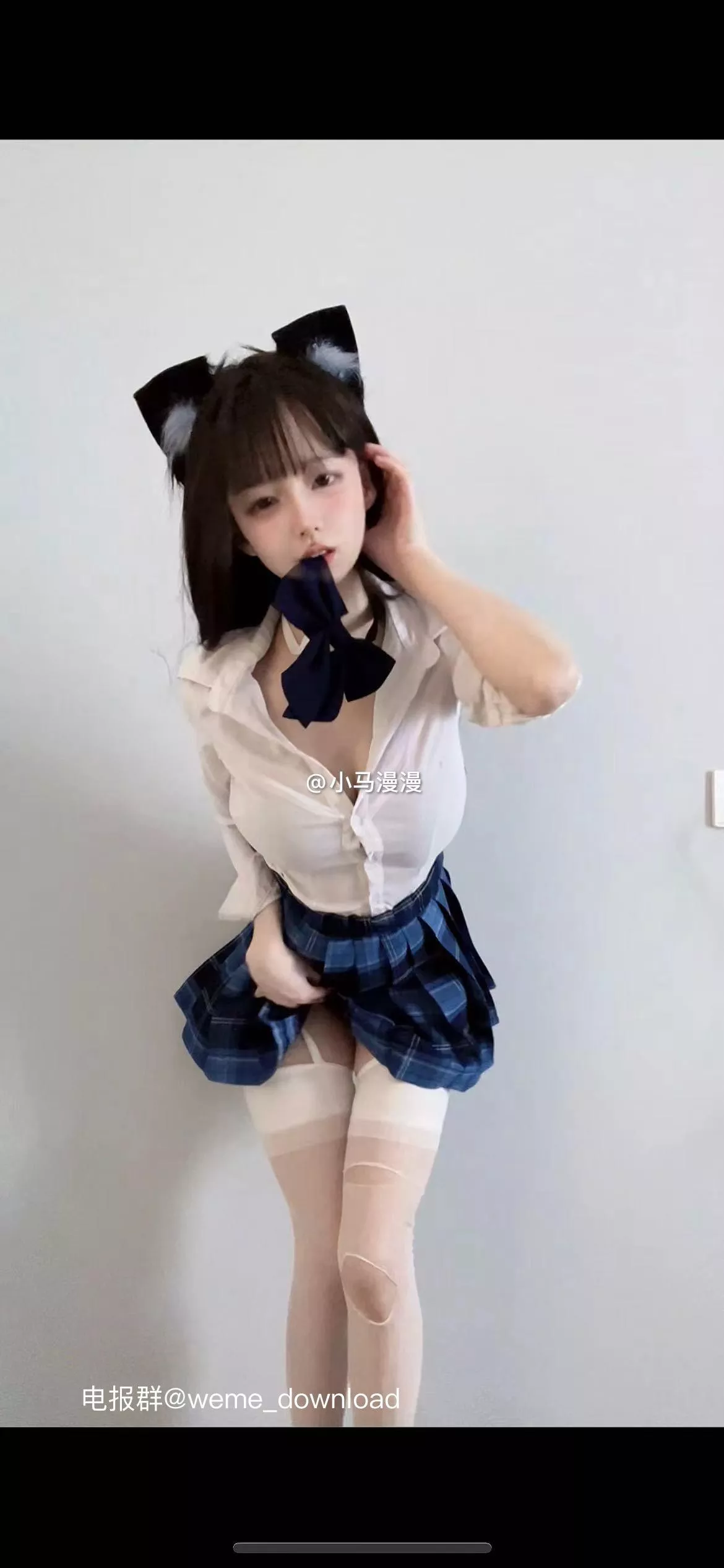 本期小马漫漫不仅展示了一种魅惑俏皮的猫耳少女形象,更是以白色衬衫和经典蓝色格裙搭配的制服风造型为主。这种清纯与性感之间的完美平衡,让人难以抗拒。