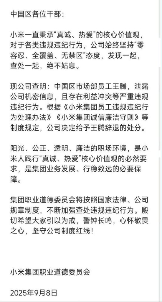 内地著名科技企业,那个什么都有的小米集团最近曝出大瓜,被视作未来接班人培养的高层管理王腾,近日被出大瓜,疑似因涉及重大泄密事件,被开除辞退。