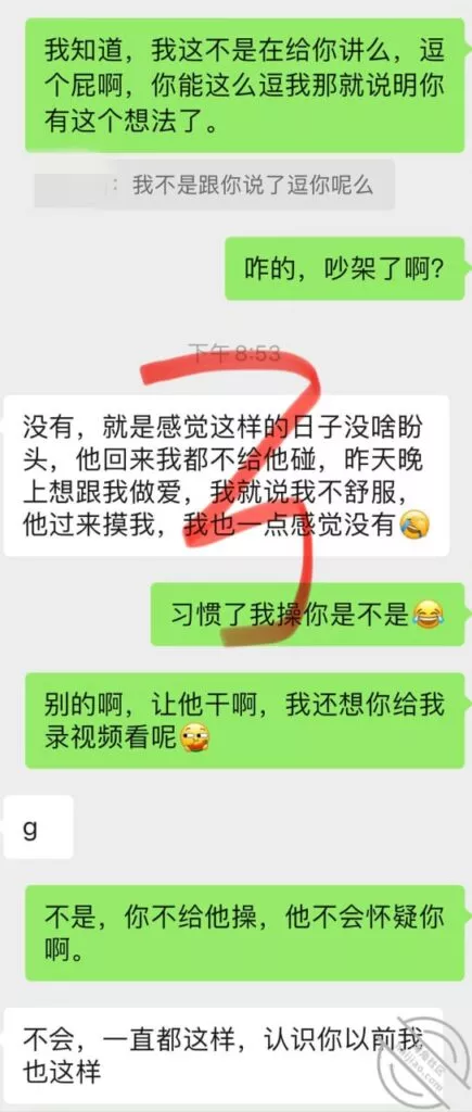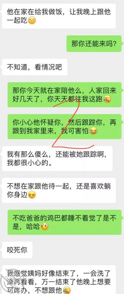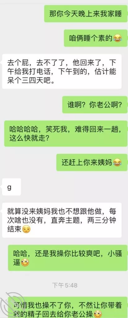 我也挺可怜,之前心心念念的等她老公来,然后体内释放她,让她B里夹满我的体液回去,让她老公舔,然后带着我的体液再被她老公Cao,可惜实现不了了,怎么就非要在姨妈来的时候回来,我俩今天聊天记录,这两天晚上我都没留她在我这睡,因为来姨妈了么,留下也干不了啥,我也觉得无聊,所以这两天每天晚上自己喝喝酒打打游戏,她就是来呆一会然后回自己家睡觉;这小娘们现在已经离不开我了,不跟我一起居然都睡不好了哈哈,不知道今天晚上跟他老公睡觉,会不会习惯性的喊个爸爸,或者给她老公玩个足交啥的,那样估计她老公马上就能想到她外面有人了吧,因为毕竟以前从来没玩过,哎,我的计划也泡汤了,心里太不爽了,还是要等下次了,不知道下次什么时候她老公才能再回来;已经第三天了吧,再有几天就可以Cao她了,很多兄弟们心心念念的小玩具,下次视频帖就可以安排上了