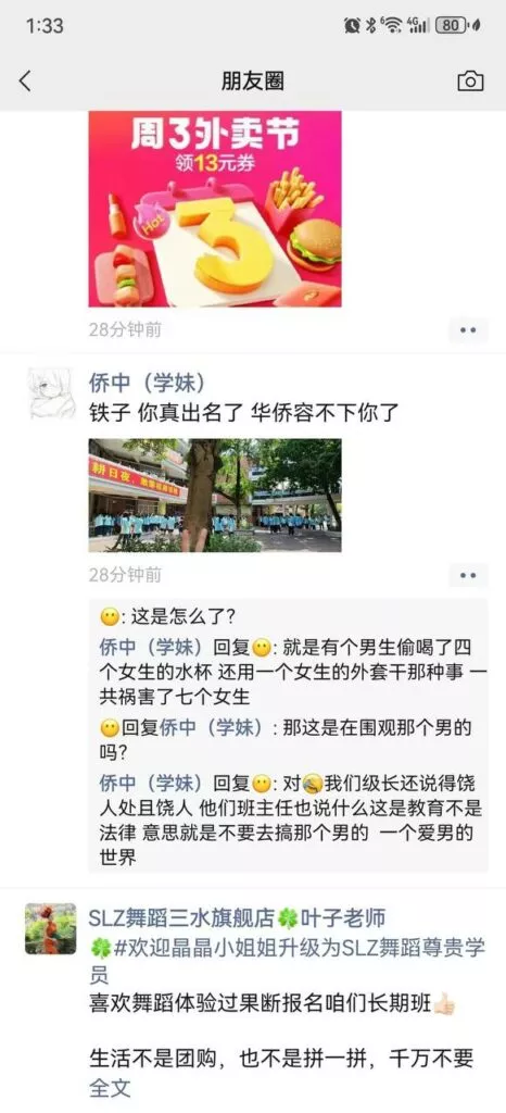 在广东佛山三水华侨中学,一位男生悄悄喝了七位女生的水杯,并借用一位女生的外套进行不当行为,引发广泛讨论。