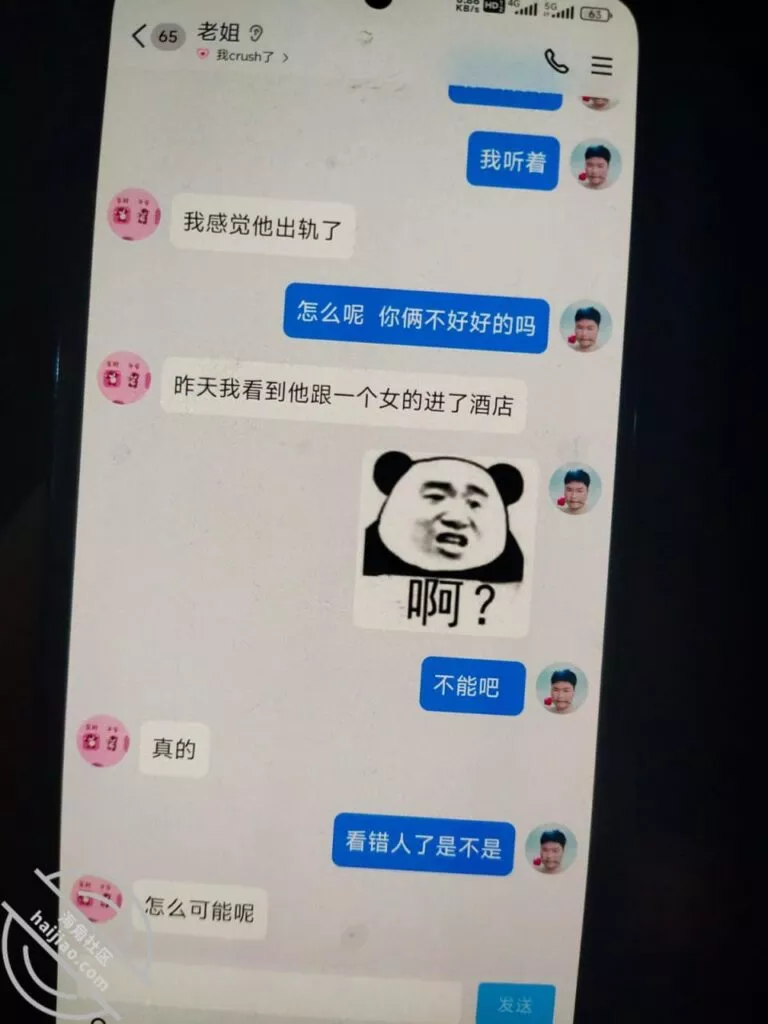 然后我姐跟她闺蜜出去逛街来着,你猜碰到啥了,他看到他这个男友搂着一个女的进了一个酒店,也不算酒店,一个小宾馆,给我姐气的啊但是他也不敢确定,因为毕竟是个侧脸,然后亲眼看见那个男的把电话挂了,然后给我姐发了一个在公司开会,这下石锤了。我姐拉着他朋友就走了,
