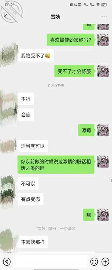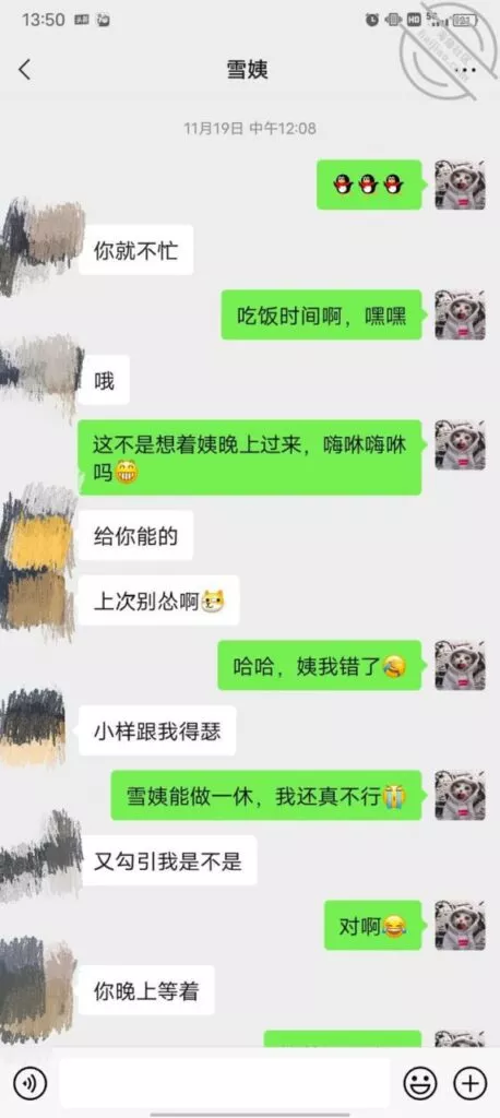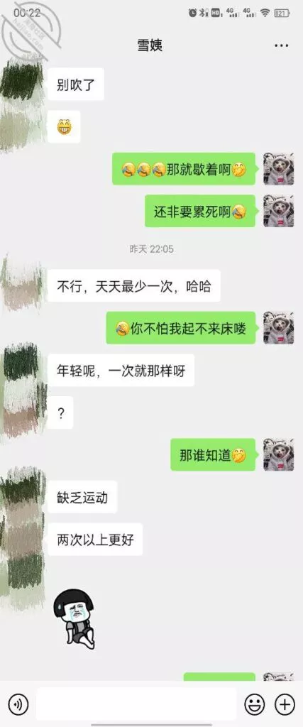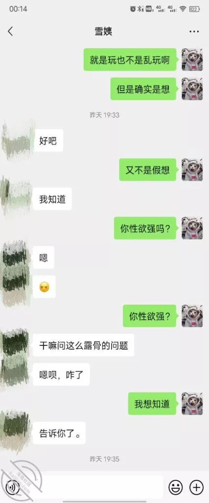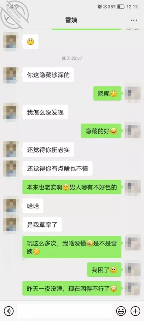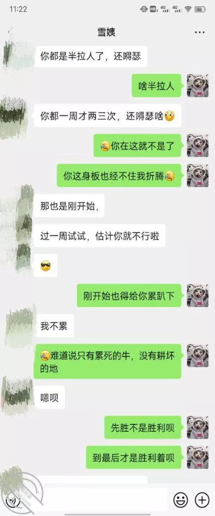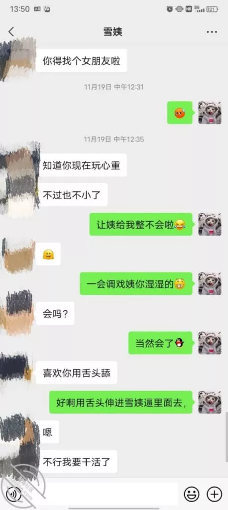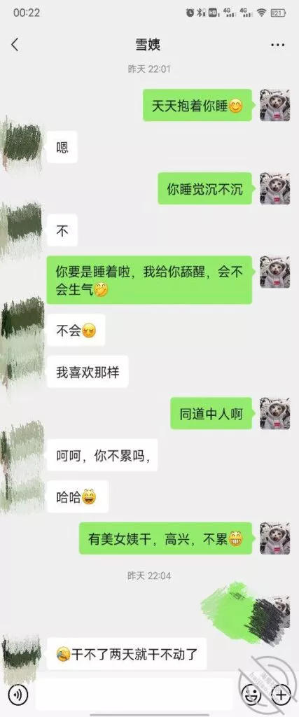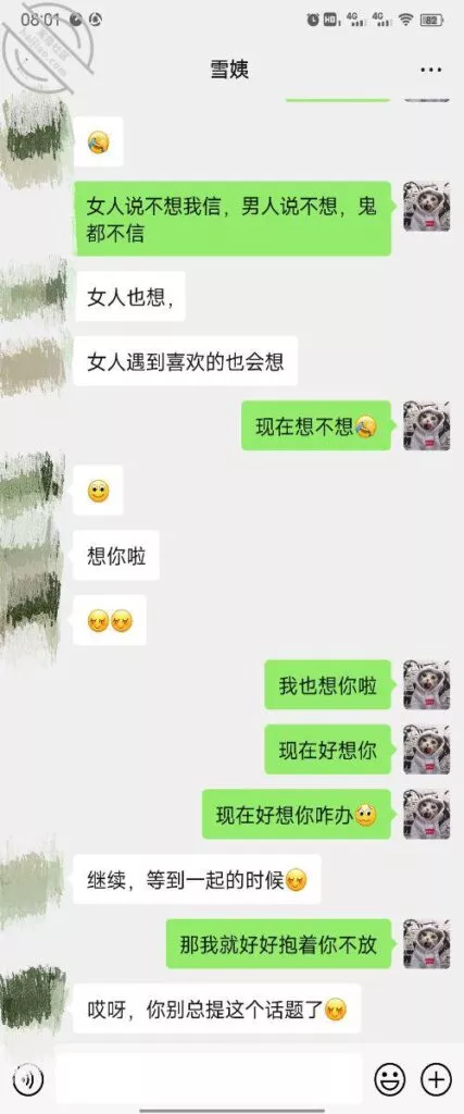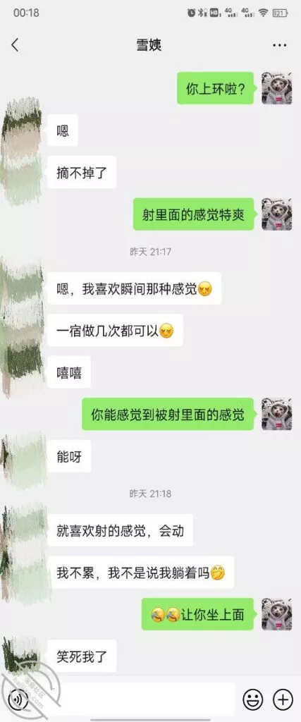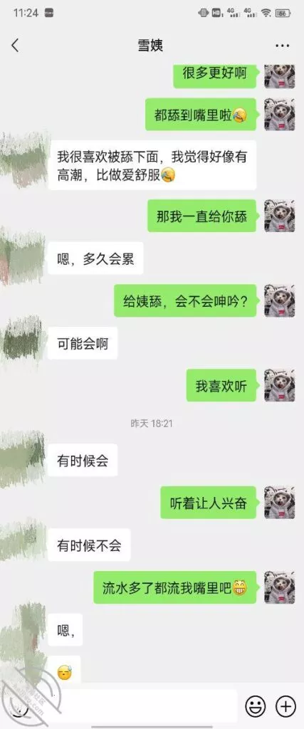 其实我忽然在想雪姨性欲这么强,每天要1-2次我这身体可撑不住啊 ,应了那句话,女人三十如狼四十如虎真是不假,,,自己都哭笑不得不说了,聊天记录都有了,自己看吧!