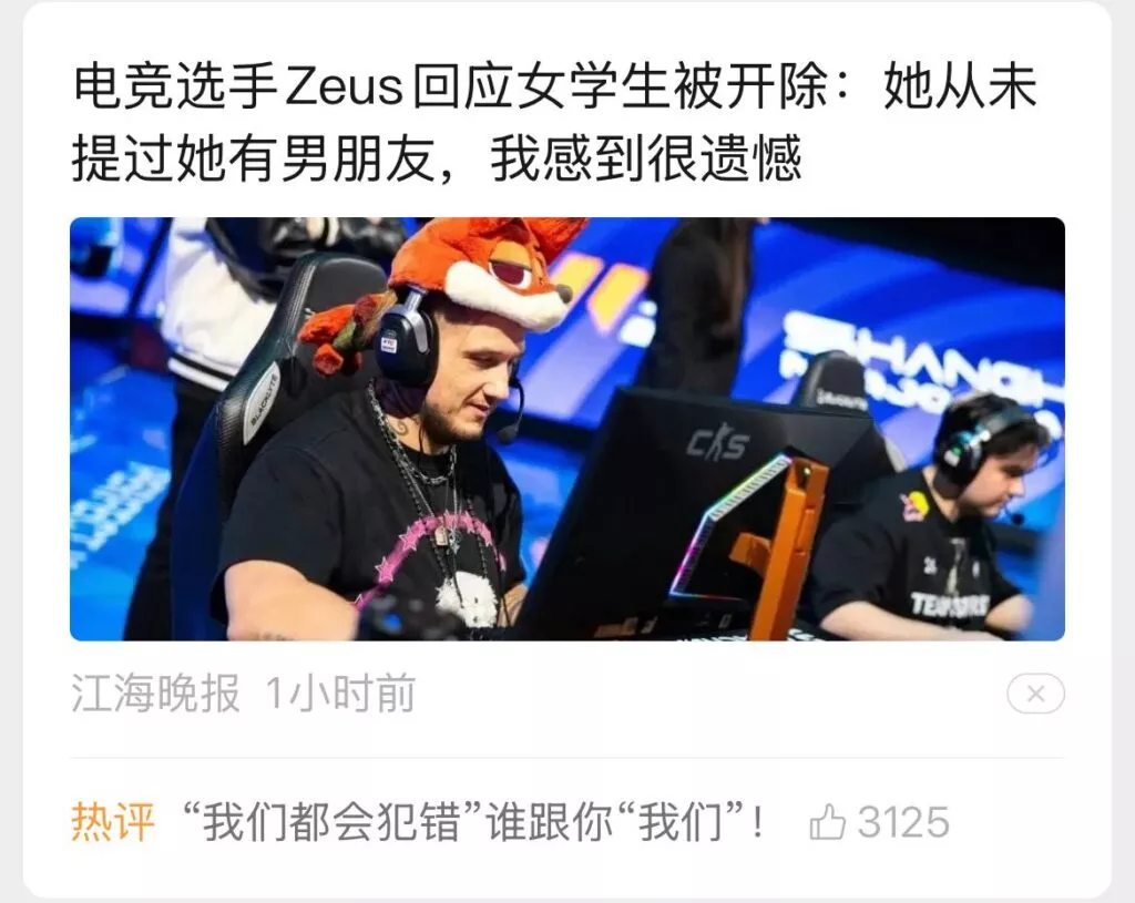csgo职业选手Zeus在得知女学生被开除后的回应:
