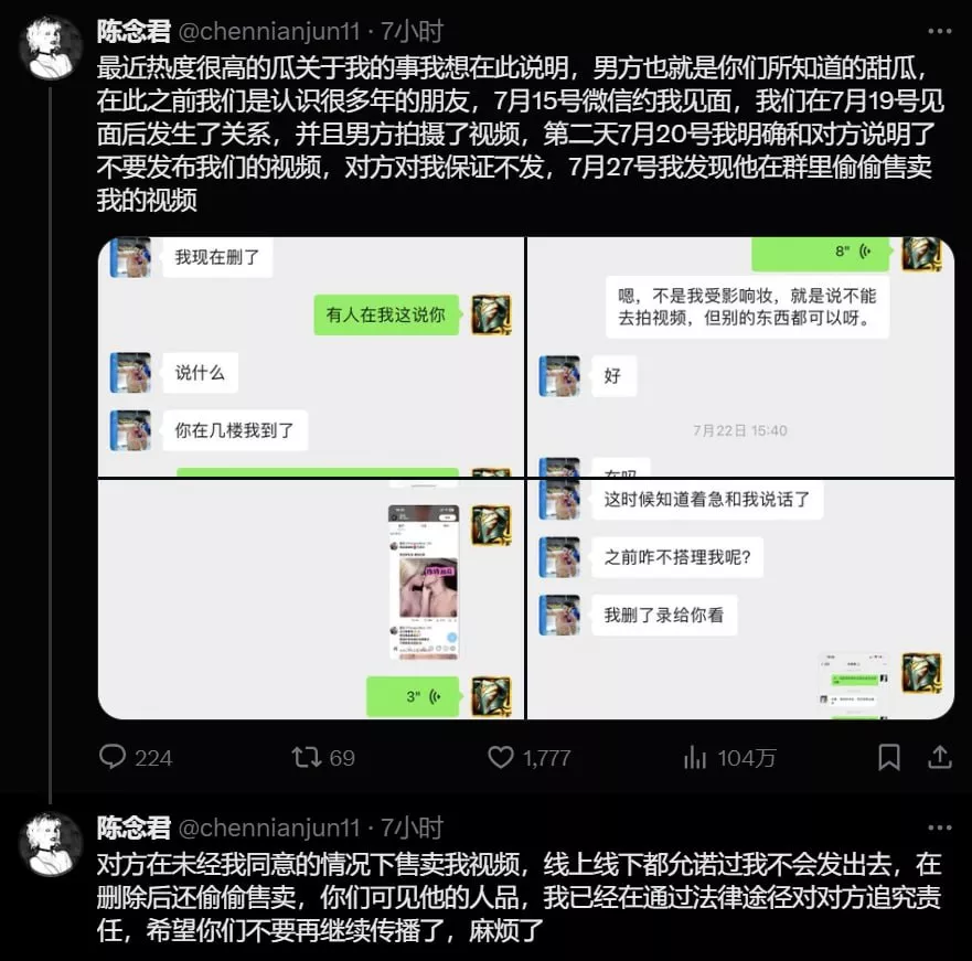 事情发生后,陈念君最终发现视频泄露的来源竟然是他的男友甜瓜